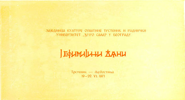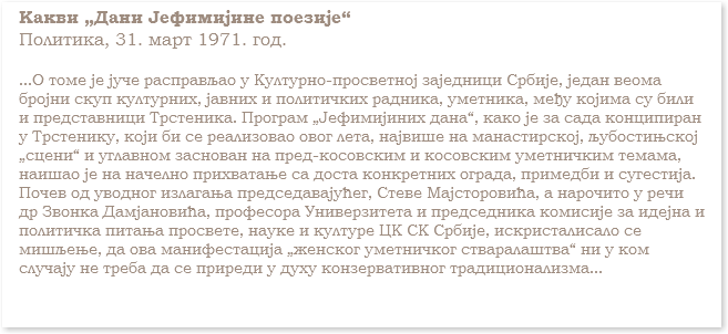 Политика, 31. март 1971. год. ...О томе је јуче расправљао у Културно-просветној заједници Србије, један веома бројни скуп културних, јавних и политичких радника, уметника, међу којима су били и представници Трстеника. Програм „Јефимијиних дана“, како је за сада конципиран у Трстенику, који би се реализовао овог лета, највише на манастирској, љубостињској „сцени“ и углавном заснован на пред-косовским и косовским уметничким темама, наишао је на начелно прихватање са доста конкретних ограда, примедби и сугестија. Почев од уводног излагања председавајућег, Стеве Мајсторовића, а нарочито у речи др Звонка Дамјановића, професора Универзитета и председника комисије за идејна и политичка питања просвете, науке и културе ЦК СК Србије, искристалисало се мишљење, да ова манифестација „женског уметничког стваралаштва“ ни у ком случају не треба да се приреди у духу конзервативног традиционализма...