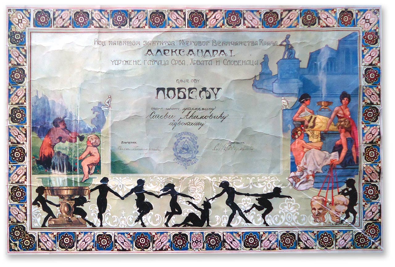Tekst POVELJE: – „Под највишом заштитом Његовог Величанства Краља АЛЕКСАНДРА I удружење глумаца Срба, Хрвата и Словенаца даје ову ПОВЕЉУ своме члану утемељачу СТЕВИ АЋИМОВИЋУ адвокату...
