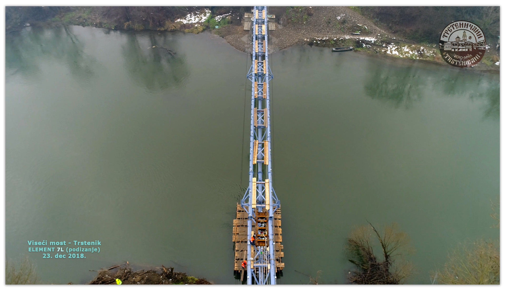 НОВО: Тог 23. децембра 2018. год. подигнут је и последњи елемент трстеничког Висећег моста на Западној Морави! Елемент 7-Л (по пројекту), био је подигнут на носеће сајле и вршила су се завршна подешавања зазора између елемената 6-Л и 8-Л моста за поставаљање на тзв. „вешаљке“. А 24. децембра 2018. постављен је и последњи тзв. 7-ЕЛЕМЕНТ на носеће сајле, прикачен је на одговарајуће место и за њега предвиђене „вешаљке“.
