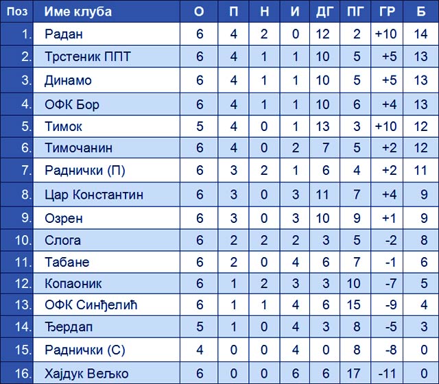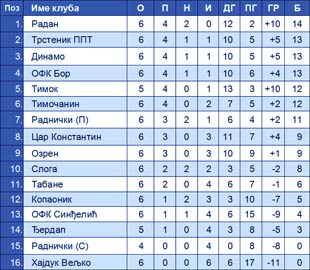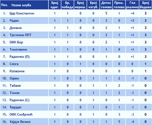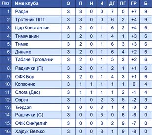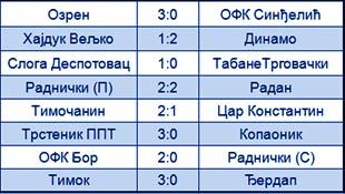 Зајечар–Гледалаца 300. Судија: Милан Митић (Лесковац) 7,5. Стрелци: Каличанин у 90. за Тимок, Милановић у 10. и Перчевић у 75. за Трстеник. Жути картони: Тодоровић (Тимок), Вукајловић, Ђурић, Адамац, М. Миловановић (Трстеник). Црвени картон: Адамац (Трстеник) у 87. мин.