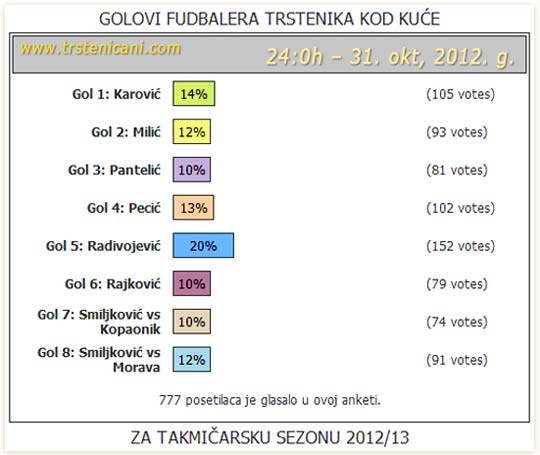 ** Glasanje za najlepši gol na domaćem terenu, će se odvijati tako da svi prikazani golovi budu ravnopravni. Može se izabrati samo jedan gol od prikazanih. Jedan posetilac glasa, samo jednom, za jedan gol tokom 24h !