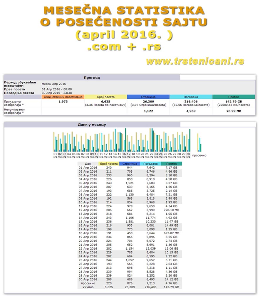 – Naš i vaš veb portal trsteničani.rs (.com), sadrži ili vam je predstavljen na 969 .html plus 353 .php stranica, što znači da sajt ukupno ima 1322 stranice! do sada. Kada ih pogledamo i posetimo, počev od onih iz 2010. godine pa do ovih najnovijih danas, možemo videti i pratiti kako smo se i mi usavršavali i napredovali učeći, trudeći se da zabeležimo najvažnije trenutke i događanja. Moramo napomenuti da iako portal trsteničani.rs nije komercijalni i reklamni sajt, da ne podržava linkove i prosleđivanja ka društvenim mrežama i bez toga, ima mesečno preko 10.000 posetilaca iz svih krajeva sveta.