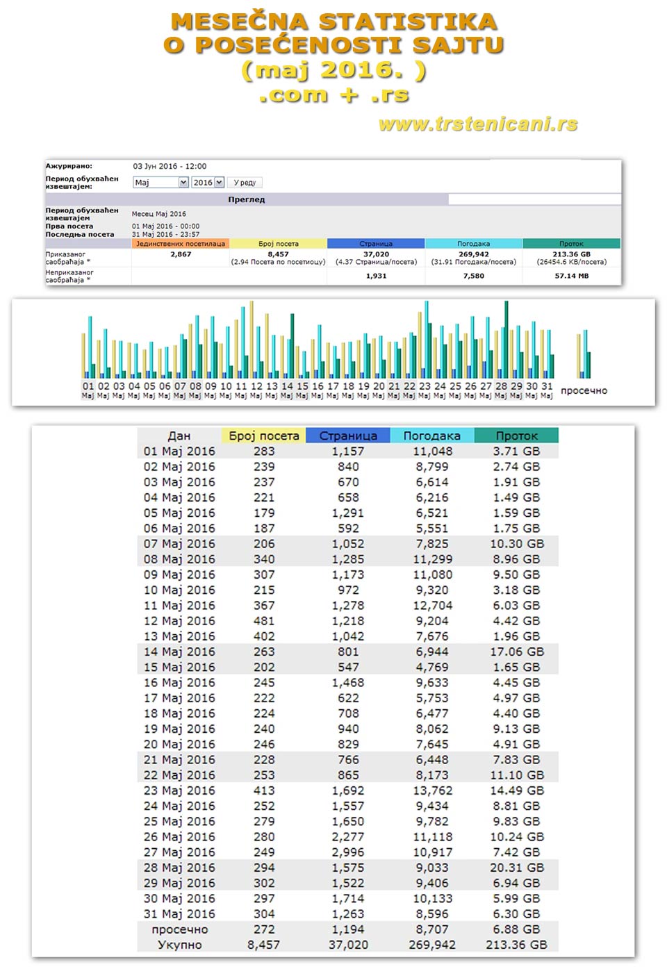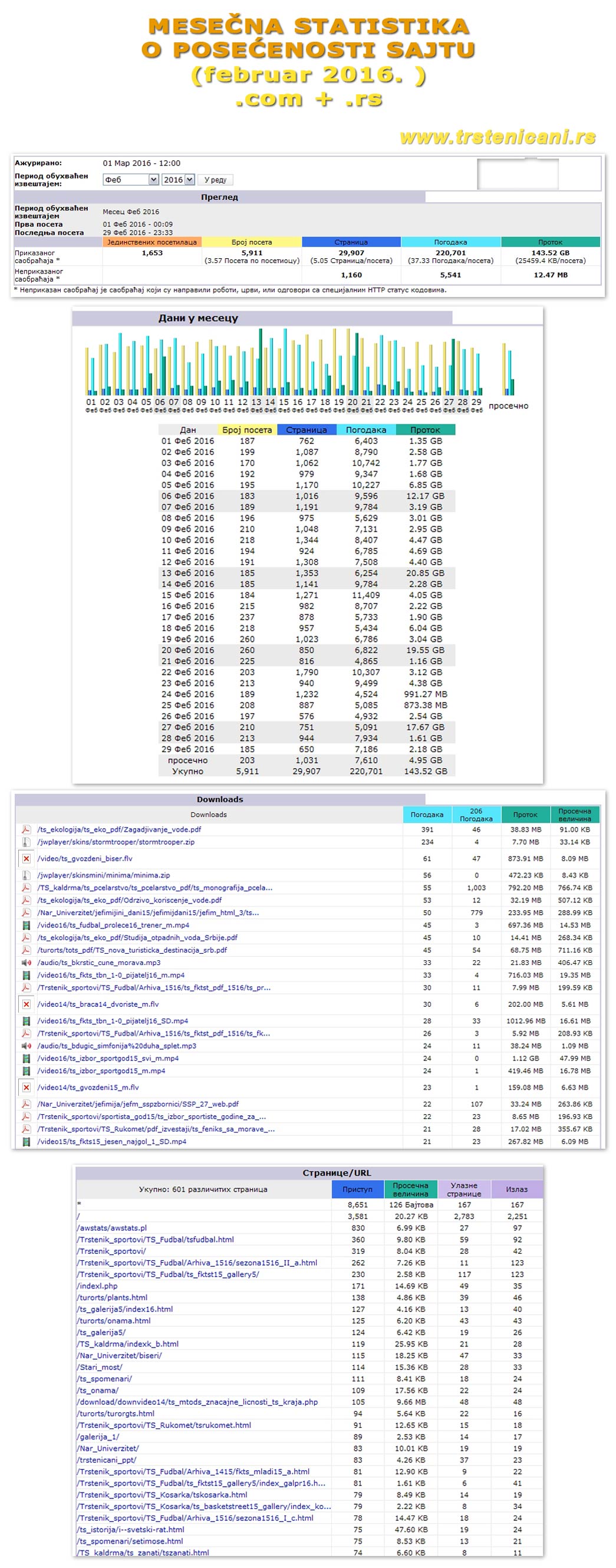 Posle nepunih 7 godina rada, odricanja i usavršavanja, osvrnuli smo se da vidimo šta je to što beleži hiljade poseta mesečno ovom portalu na internetu. Data je „komanda“ sistem ing-u da pusti program i preuzme sa servera podatke iz svakog direktorijuma, da zaviri u svaki fajl, tekst i sliku. Kada je to program uradio (za tili čas), nastao je veliki „znak čuđenja i neverice“. Sve je propušteno još par puta i pregledano za svaki slučaj, ali kompjuter nam uporno govori da se ne čudimo i da ga ne „maltretiramo“ više. Server je nastavio da opslužuje svoje posetioce sajta, nije imao vremena da se „bakće“ sa nama. Podatke što nam je dao kao i uvek delimo sa vama, jer svemu ovome ste doprineli i Vi naši Trsteničani, koji ste nam ulepšavali video snimke, fotografije i tekstove. Podaci su ažurirani 3. marta 2017. godine.