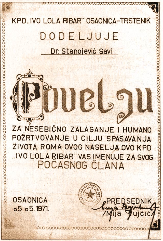 Rade Mitrović, ciganski kmet, je otišao kod doktora Save tražeći pomoć za Rome koji su živeli u romskom naselju Stara čaršija na obodu trsteničke varoši, u predgrađu Osaonica. Zanimljivo je da su se Romi obratili za pomoć baš lekaru, a ne nekom ko je u tom momentu mogao imati određenu civilnu ili političku vlast. Sava je obećao Radetu Mitroviću da će na svaki način pomoći romskom naselju, ali i da nikome ne govori o ovom njihovom susretu i razgovoru. Doktor Sava se dosetio da je u trsteničkom selu Medveđa (udaljenom desetak kilometara od varoši) bilo obolelih i umrlih od pegavog tifusa, kao i da su u romskom naselju tih dana preminula dva starija Roma-jedan od tuberkuloze, a drugi od starosti. Doktor Sava je zato, nemačkoj komandi u Kruševcu i nadležnom higijenskom zavodu u Nišu poslao dopis o pojavi pegavog tifusa u romskom naselju na obodu trsteničke varoši. Dao je da se celo romsko naselje ogradi bodljikavom žicom i da se svuda na ulazu u grad kao i na ulazu u romsko naselje postave table na nemačkom jeziku „Achtung, fleckfieber !“ Romima je zabranjen izlaz iz naselja, a odmah je iz Vrnjačke banje dopremljen aparat za dezinfekciju i dezinsekciju prostorija u kućama romskog naselja, kao i aparat za devašizaciju odeće i posteljine. Doktor Sava je svakodnevno, na zaprežnim kolima, u naselje dopremao sapun i najosnovnije životne namirnice - pasulj, brašno, krompir - koje je delio ravnopravno na osnovu broja članova po porodici. Dana 14. oktobra 1942. godine, ispred romskog naselja u Osaonici pojavila se nemačka ekspedicija koja se sastojala od nekoliko kamiona, spremnih za prevoz Roma, u pratnji naoružanih nemačkih vojnika. Nadležni oficir se, preko tumača, obratio romskom kmetu Radetu Mitroviću, sa pitanjem ko je postavio tablu sa obaveštenjem o pegavom tifusu. Doznavši da je u pitanju trstenički doktor Stanojević, poslao je jedno vozilo po doktora Savu. Nezadovoljan, nemački oficir je prilično grubo ispitivao doktora Savu, želeći da zna da li je epidemija prijavljena, od kada traje i koje su mere preduzete. Radio vezom je proverio sa higijenskim zavodom u Nišu i nemačkom komandom u Kruševcu, odakle su mu stigle potvrde da je epidemija uredno prijavljena. Razdražen, oficir je izdao naredbu da se nemački konvoj vrati nazad i na kraju poželeo kompletnom naselju, zajedno sa doktorom koji ih je lečio, da zaista i svi stradaju od ove epidemije. Doktor Sava je za svaki slučaj u krantinu i izolaciji držao romsko naselje još šest meseci. Trstenička romska populacija je, zahvaljujući podvigu doktora Save, bila jedna od retkih na čitavoj srpskoj, ali i evropskoj teritoriji, koju je okupirao tadašnji Treći rajh, odakle nije streljan ili u logore odveden ni jedan pripadnik zajednice. Istinu o karantinu, doktor Sava je svojim sugrađanima otkrio tek posle Drugog svetskog rata. Romi su se svom dobrotvoru zahvalili (i dalje to čine) na sebi svojstven način. Svakog četrnaestog oktobra, iz romskog naselja u Osaonici kreće duga povorka ka kući doktora Save. Oni nose uramljene slike Savine na kojima piše „Sveti Sava“ i „Doktor Sava - naša slava“. Povorka bi se zaustavila pred Savinom kućom u Obilićevoj ulici br. 11, doktor Sava bi se popeo u čezu sa svojom suprugom Darom, i Romi bi ih odvezli sve do centra grada gde bi bila izvođena predstava „Ciganska bol“.
