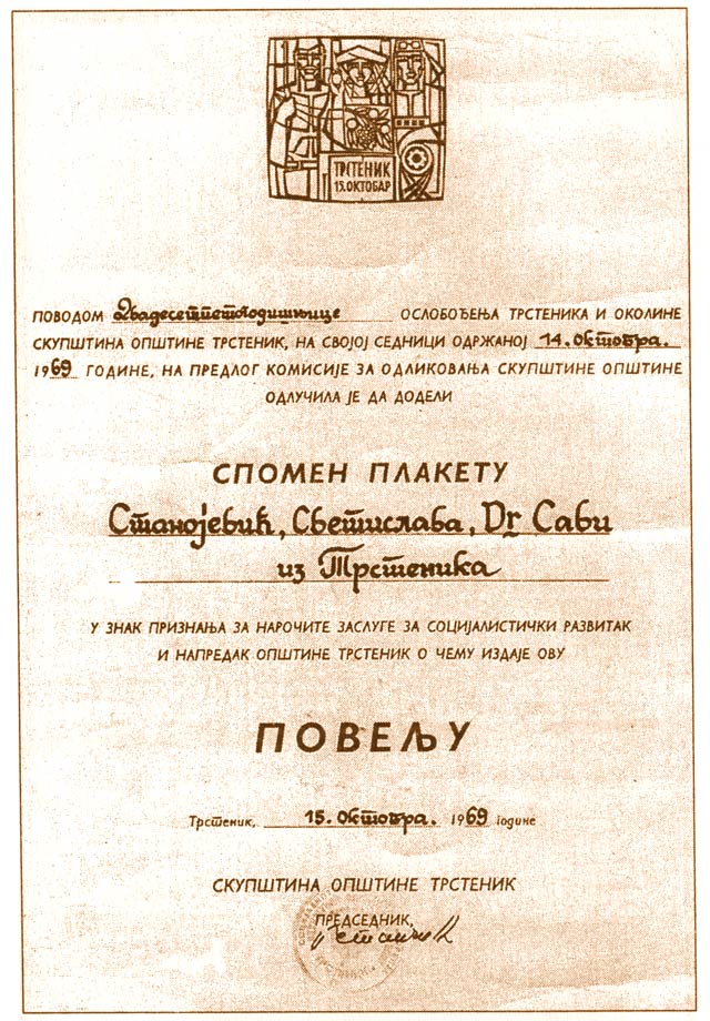 Takođe, mada vlada generalna ocena da se „velikgim lekarima u malim mestima“ dotične opštine i sama država, nisu odužile na pravi način, te da im „ni spomen obeležja nisu podignuta“, malo je drugačija stvar sa trsteničkim dobrotvorom dr Savom Stanojevićem. Danas, trstenički Dom zdravlja s' ponosom nosi ime ovog plemenitog čoveka i vrhunskog lekara, a na ulazu u romsko naselje stoji bronzana spomen-tabla u slavu doktora Save, romske slave.