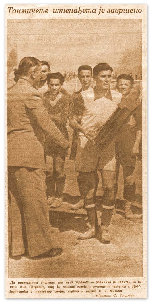 ...Када је утакмица завршена, играчи су се постројили пред главном трибином. Претседник општане сишао је на терен у пратињи чланова управе С. К. 1913 и после срдачног поздравног говора предао је врло леп, позлаћен пехар капитену тима „црвено-белих“ Аци Петровићу, а затим је сваком играчу појединачно честитао на лепом успеху што је публика поздравила дугим и о душевљеним пљескањем... Првих четврт сата игра је била веома занимљива и лепа. Још одмах у почетку „црвено-бели“ су наметнули противнику врло оштар темпо и настојали су да што пре реше судбину пехара...